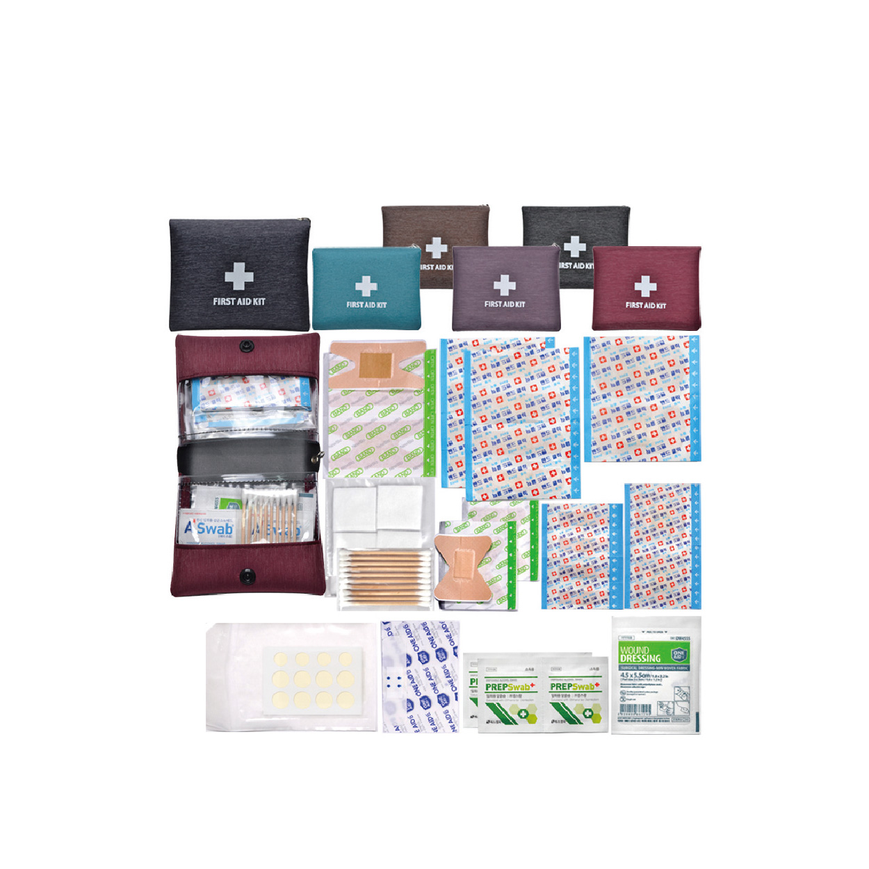 하이드로콜로이드밴드12P/표준밴드8p/대형밴드2p/사각밴드2p/ 미니밴드4p/손끝밴드2p/관절밴드2p/방수밴드2p/알콜솜4p/ 드레싱밴드/10p면봉/절솜4P/구급케이스 ※밴드이미지는 변경될수있음 / OPP포장포함 / 종이케이스비용은 별도