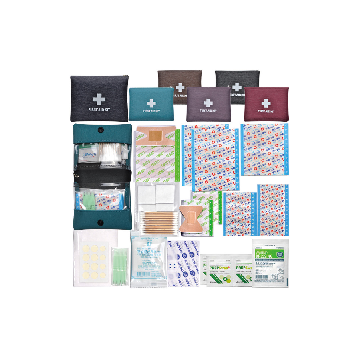 하이드로콜로이드밴드12P/표준밴드8p/대형밴드2p/사각밴드2p/ 미니밴드4p/손끝밴드2p/관절밴드2p/방수밴드2p/알콜솜4p/드레싱밴드/ 멸균거즈5p/10p면봉/절솜4P/10P치간칫솔/구급케이스 ※밴드이미지는 변경될수있음 / OPP포장포함 / 종이케이스비용은 별도