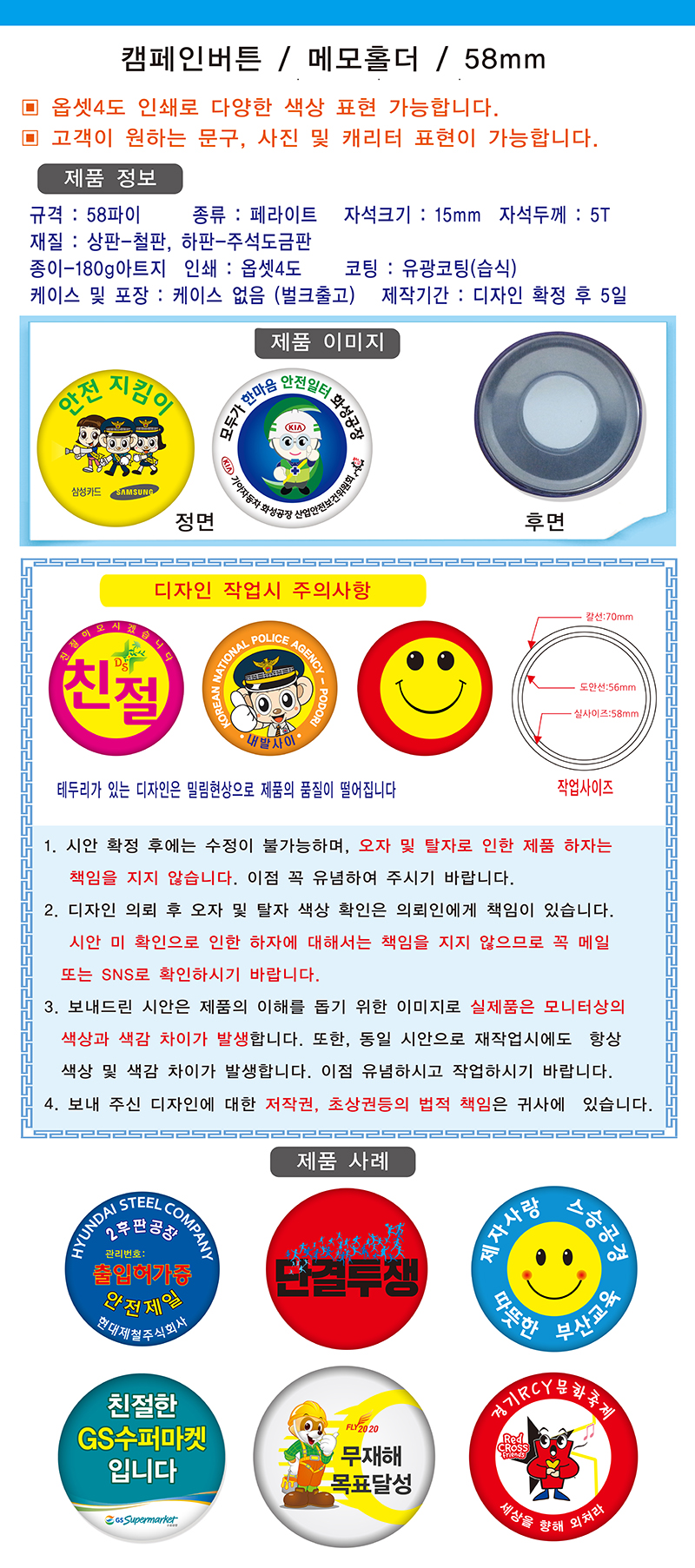 •1,000EA •기본수량 : 100EA •1,000개 이하 가격 별도 문의 •도안선:56mm / 칼선:71mm 제품 상세 설명 / - 재질 : 철판 / 옵셋인쇄 (유광코팅) - 케이스 및 포장 : 케이스 없음 (벌크출고) - 제작기간 : 디자인 확정 후 5일