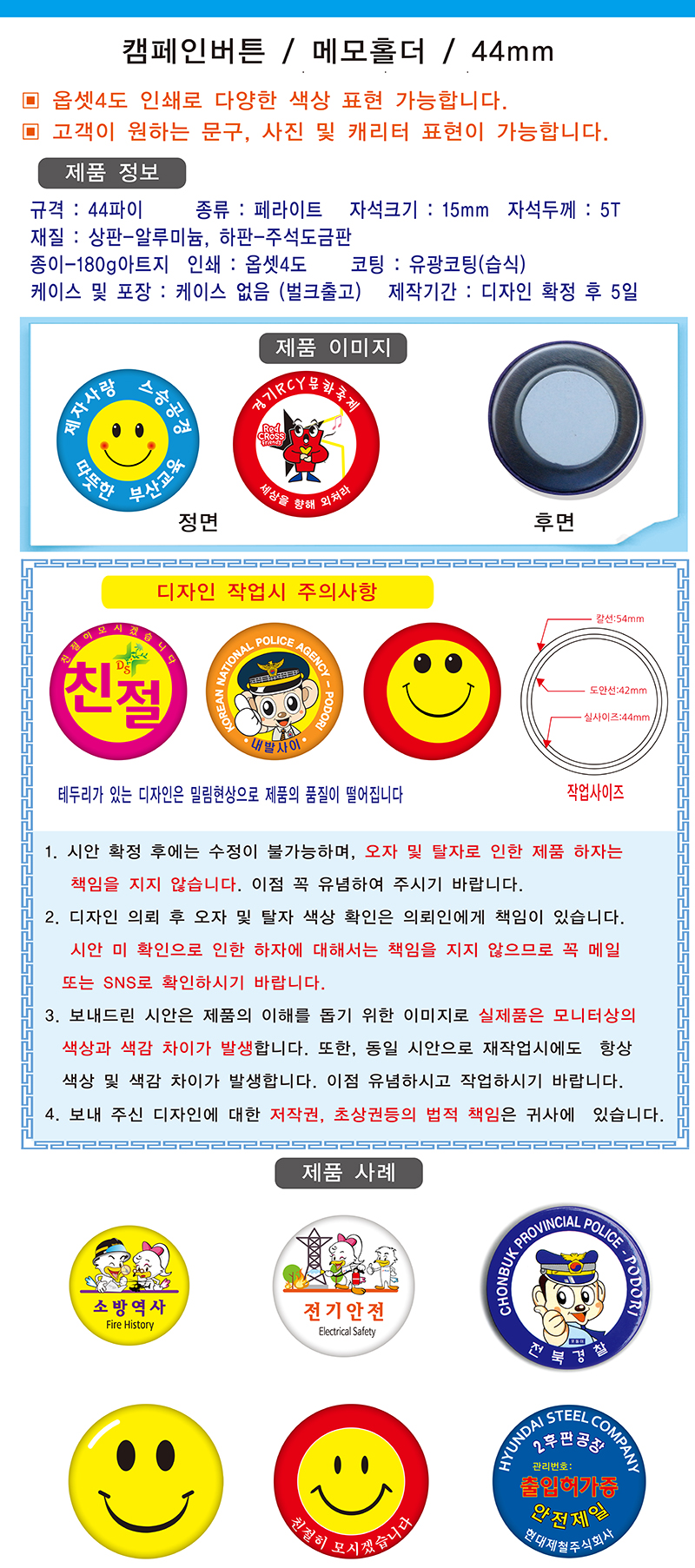 •1,000EA •기본수량 : 100EA •1,000개 이하 가격 별도 문의 •도안선:42mm / 칼선:54mm 제품 상세 설명 / - 재질 : 철판 / 옵셋인쇄 (유광코팅) - 케이스 및 포장 : 케이스 없음 (벌크출고) - 제작기간 : 디자인 확정 후 5일