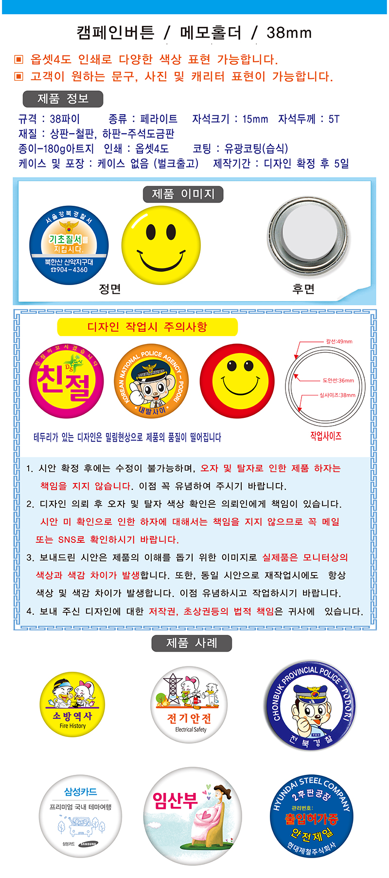 •1,000EA •기본수량 : 100EA •1,000개 이하 가격 별도 문의 •도안선:36mm / 칼선:49mm 제품 상세 설명 / - 재질 : 철판 / 옵셋인쇄 (유광코팅) - 케이스 및 포장 : 케이스 없음 (벌크출고) - 제작기간 : 디자인 확정 후 5일