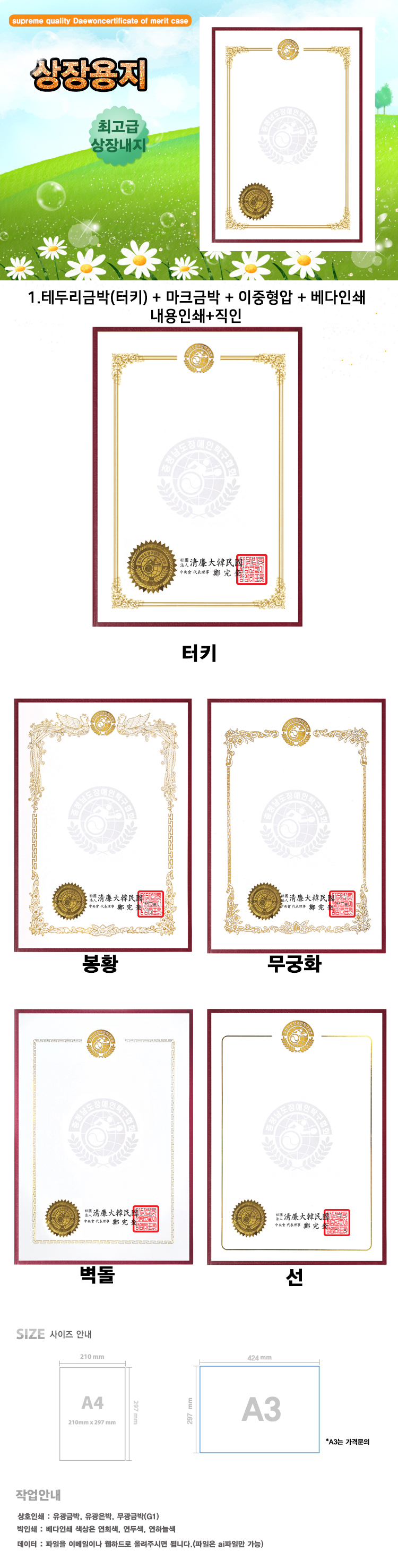 테두리+마크(금박)+마크(베다)+이중형압+내용인쇄+직인