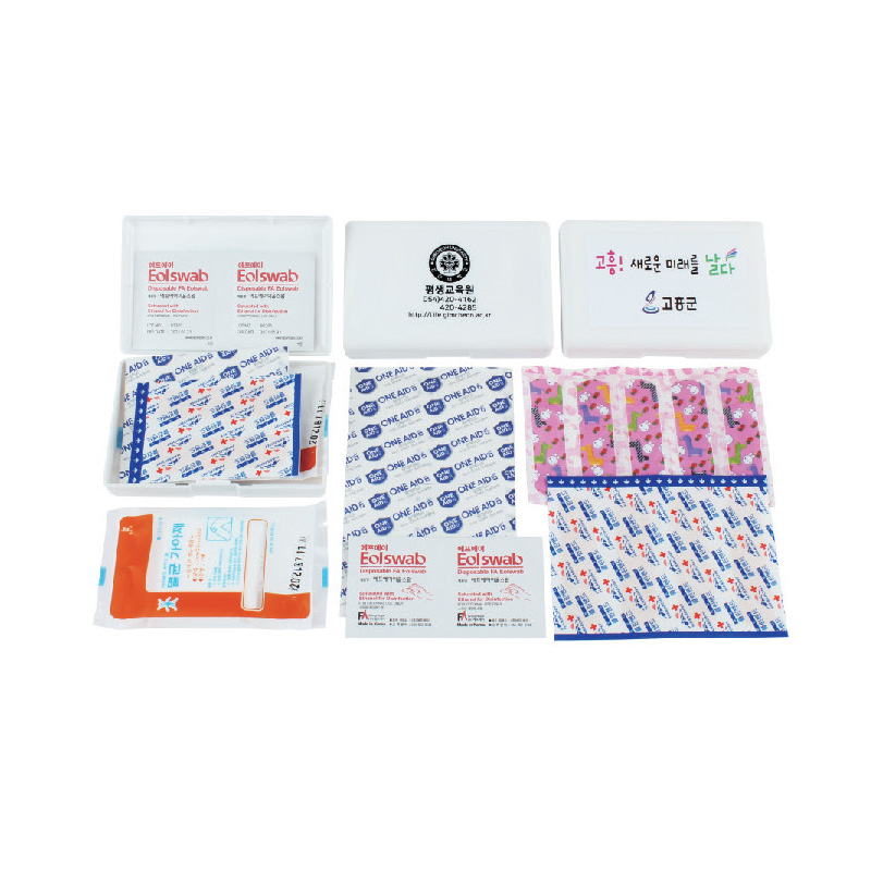 •SIZE : 115X75X22(mm) •수량 : 400EA / 1박스 : 250개 •스티커 비용 별도 • 멸균거즈(5x5), 방수밴드 4매, 표준밴드 4매, 알콜스왑 2매, 캐릭터밴드 5매 ※모든 내용물들은 수급상황에 따라 예고없이 변경될 수 있습니다.