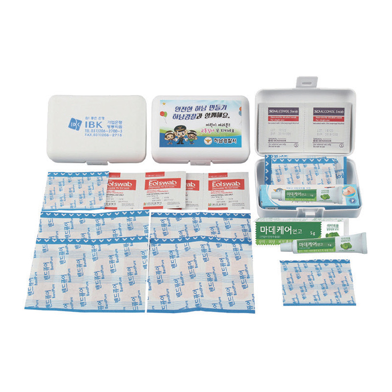 •SIZE : 112X79X36(mm) •종이케이스 200원 추가 •수량 : 400EA / 1박스 : 250개 •스티커 비용 별도 •혼합밴드 22매, 알콜스왑 4매, 상처연고 ※모든 내용물들은 수급상황에 따라 예고없이 변경될 수 있습니다.