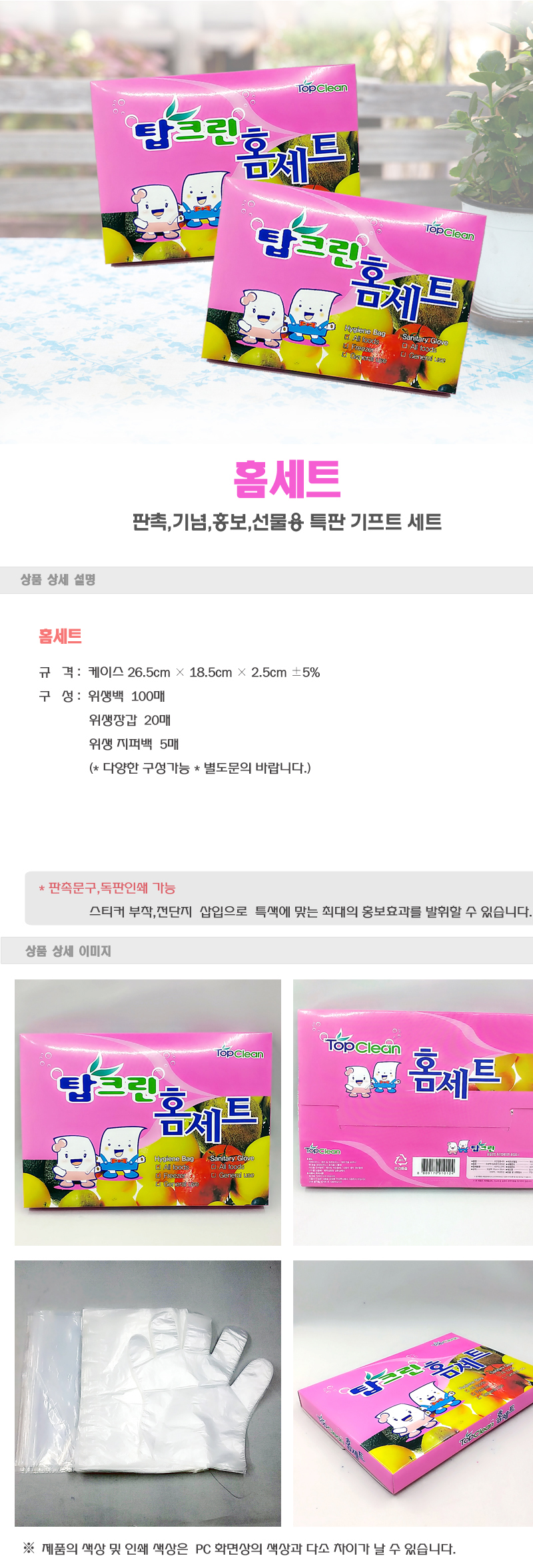 •구성 : 위생백100매 / 위생장갑20매 /지퍼백5매 •1Box 50ea입 ※ 전제품 박스단위출고