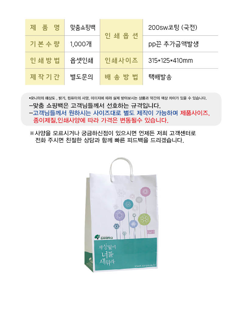 •200sw 코팅 •기본수량 1,000개 •pp끈 50원 추가 •Size : 315x125x410 mm