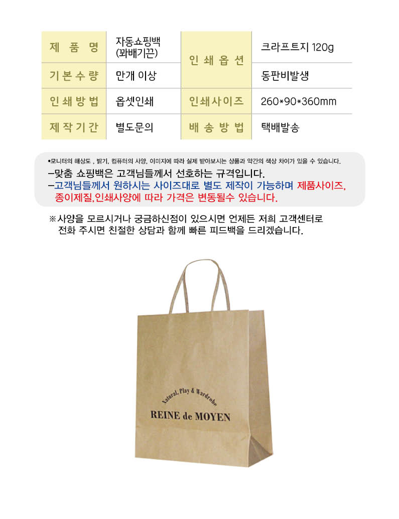 별도문의 •크라프트지 120g •기본수량 10,000개 이상 •Size : 260x90x360 mm •동판비 별도
