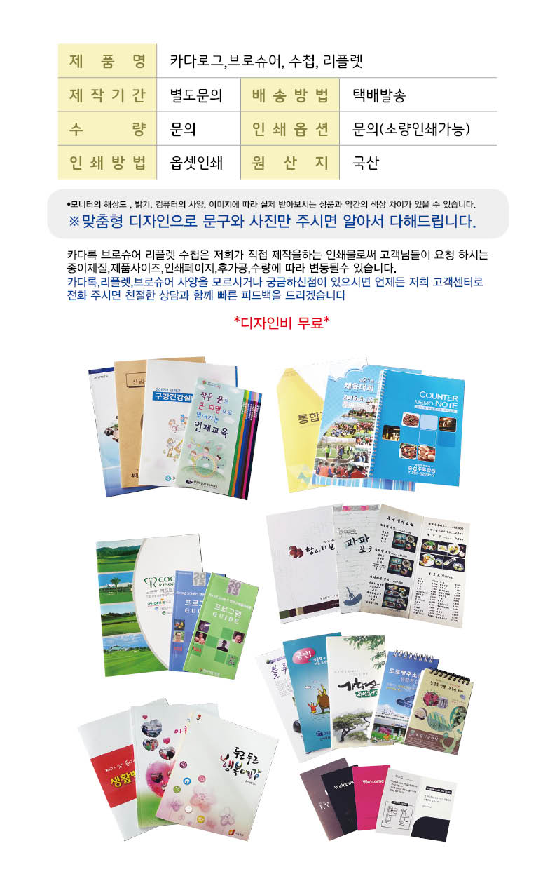 가격별도문의 •각종 카다록, 브로슈어, 수첩, 리플렛 (상담시-사이즈, 페이지, 수량 확인후) ※ 소량인쇄가능