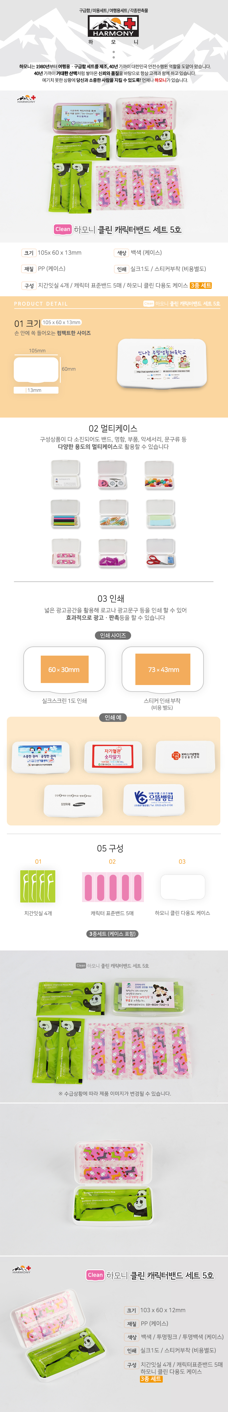•캐릭터밴드 5매, 치간잇실 4개 •수량 : 1000EA •SIZE:105×60×13 (mm) •1BOX:500EA •스티커비 별도, 캐릭터밴드 1P추가 30원, 알콜스왑 1P 추가 30원 ※상품 내 모든 구성상품들은 수급상황에 따라 예고없이 변동 될 수 있습니다.