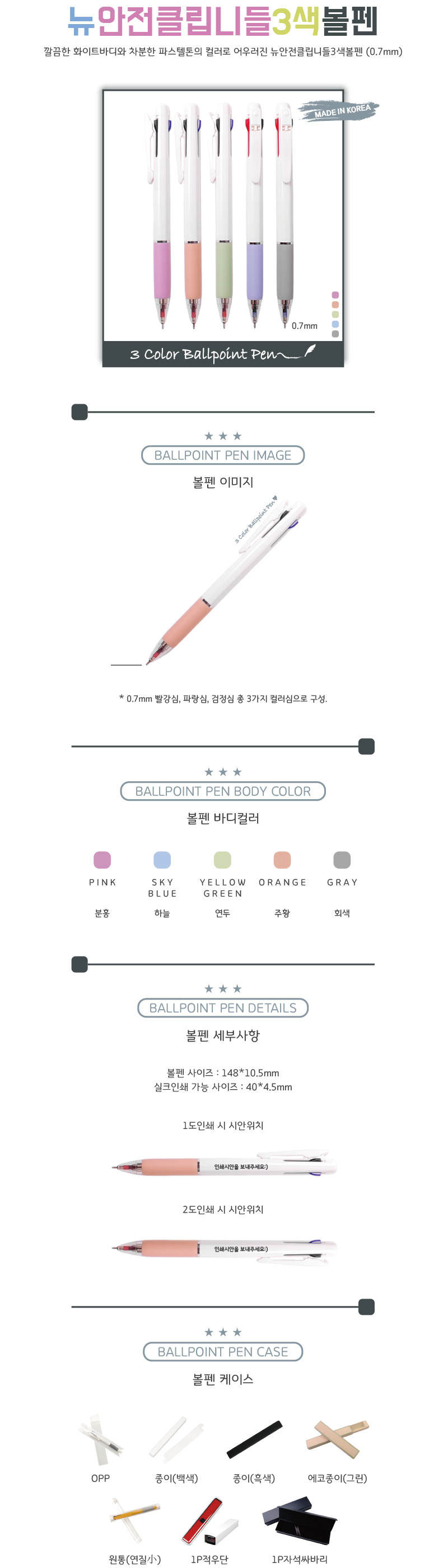 깔끔한 화이트바디와 차분한 파스텔톤의 컬러로 어우러진 뉴안전클립니들3색볼펜